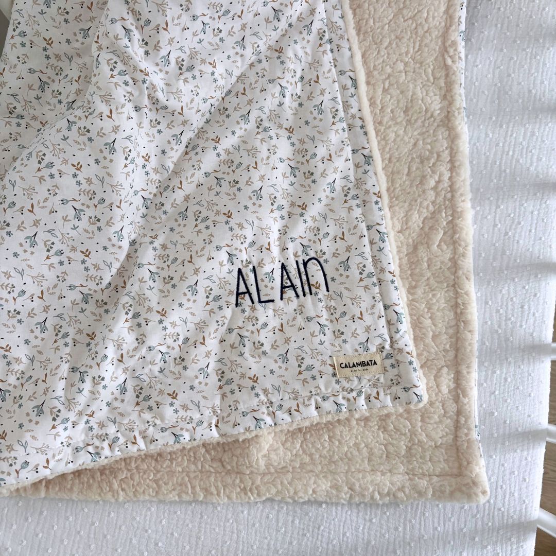 Manta borreguito estampado Andrea con el nombre bordado Alain en azul oscuro.
