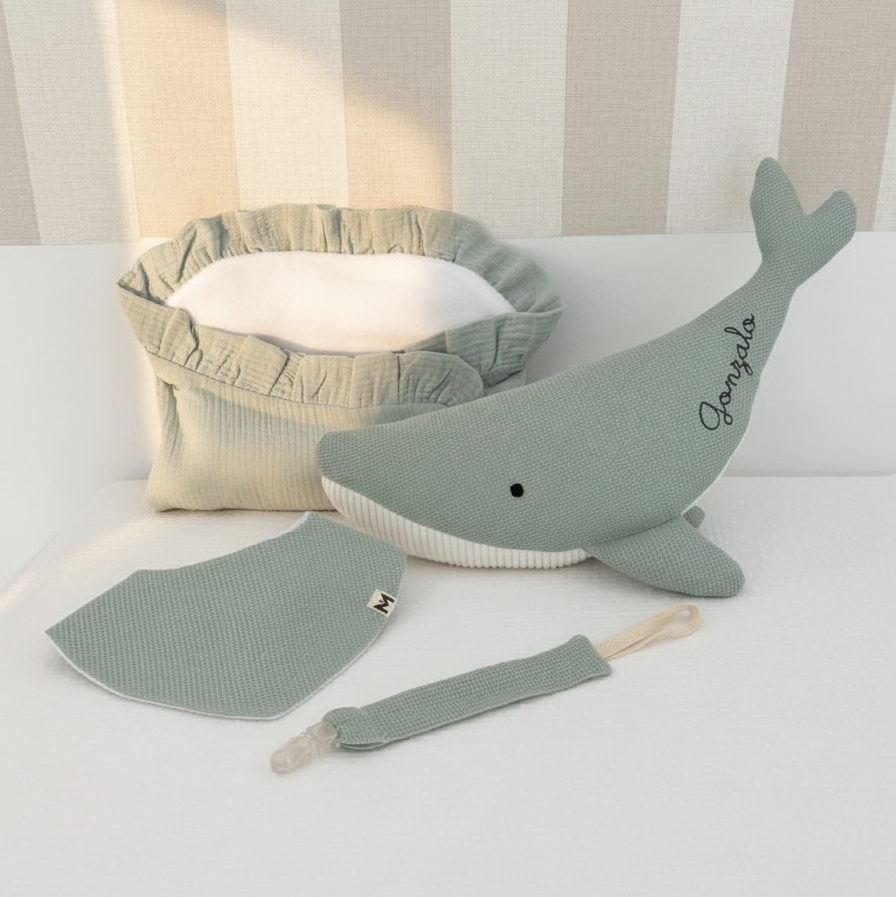 - 🐳 Peluche ballena Susi: Personalizable con el nombre del bebé y funcional como cojín antivuelco para mayor seguridad en el descanso.