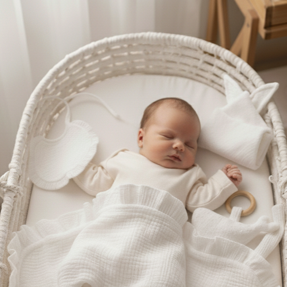 Incluye: mantita de verano con volante alrededor y muselina doble + Babita de rizo de bambu + Babero super absorbente + Chupetero + Sonajero mini Susi + Doudou